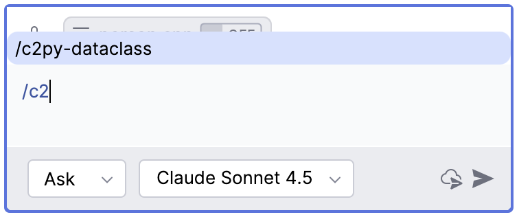 /c2py-dataclass, 仅需在项目目录中添加.github/prompts/c2py-dataclass.prompt.md文件, 立马就会在 Copilot 中出现一个/c2py-dataclass命令,在.github/prompts/c2py-dataclass.prompt.md添加所需的提示词即可。要像