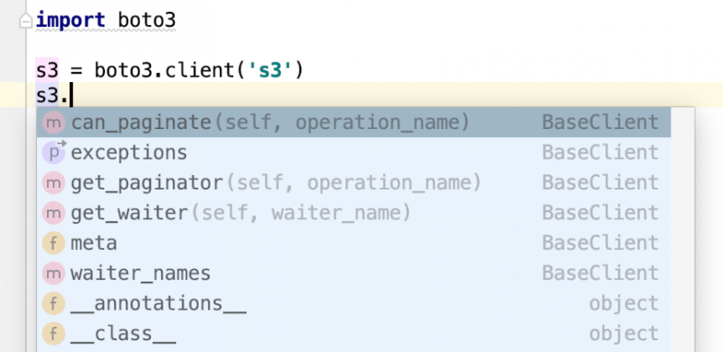 - botostubs: 与 boto3 API 保持更新(每三天),并支持众多 IDE, 试过在 IntelliJ IDEA 和 Visual Studio Code 中可用