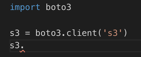 Visual Studio Code 中对 s3 = boto3.client('s3') s3. 没有任何提示