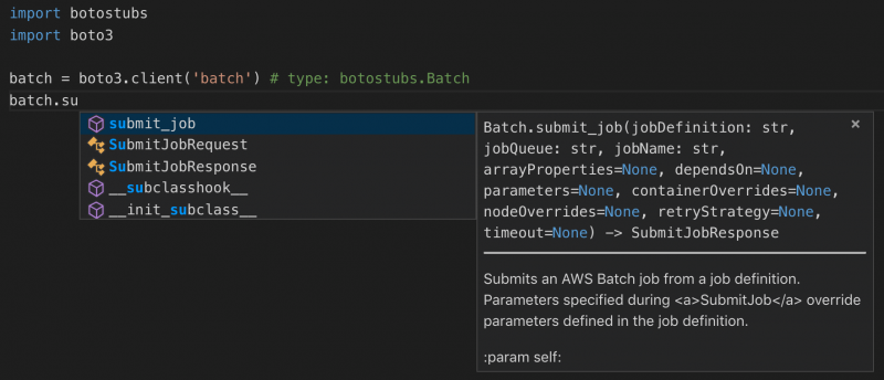 在 Visual Studio Code 中也可以用 batch: botostubs.Batch = boto3.client('batch') 的形式,但是不支持文档注释方式