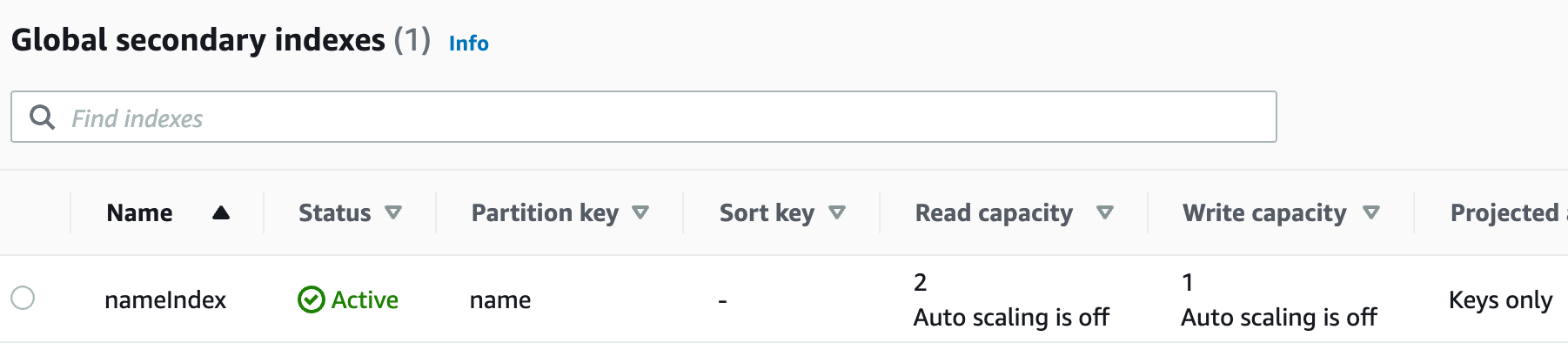 创建一个表,只有 Partiton Key 为 id, 并创建以 name 它段的全局二级索引 nameIndex