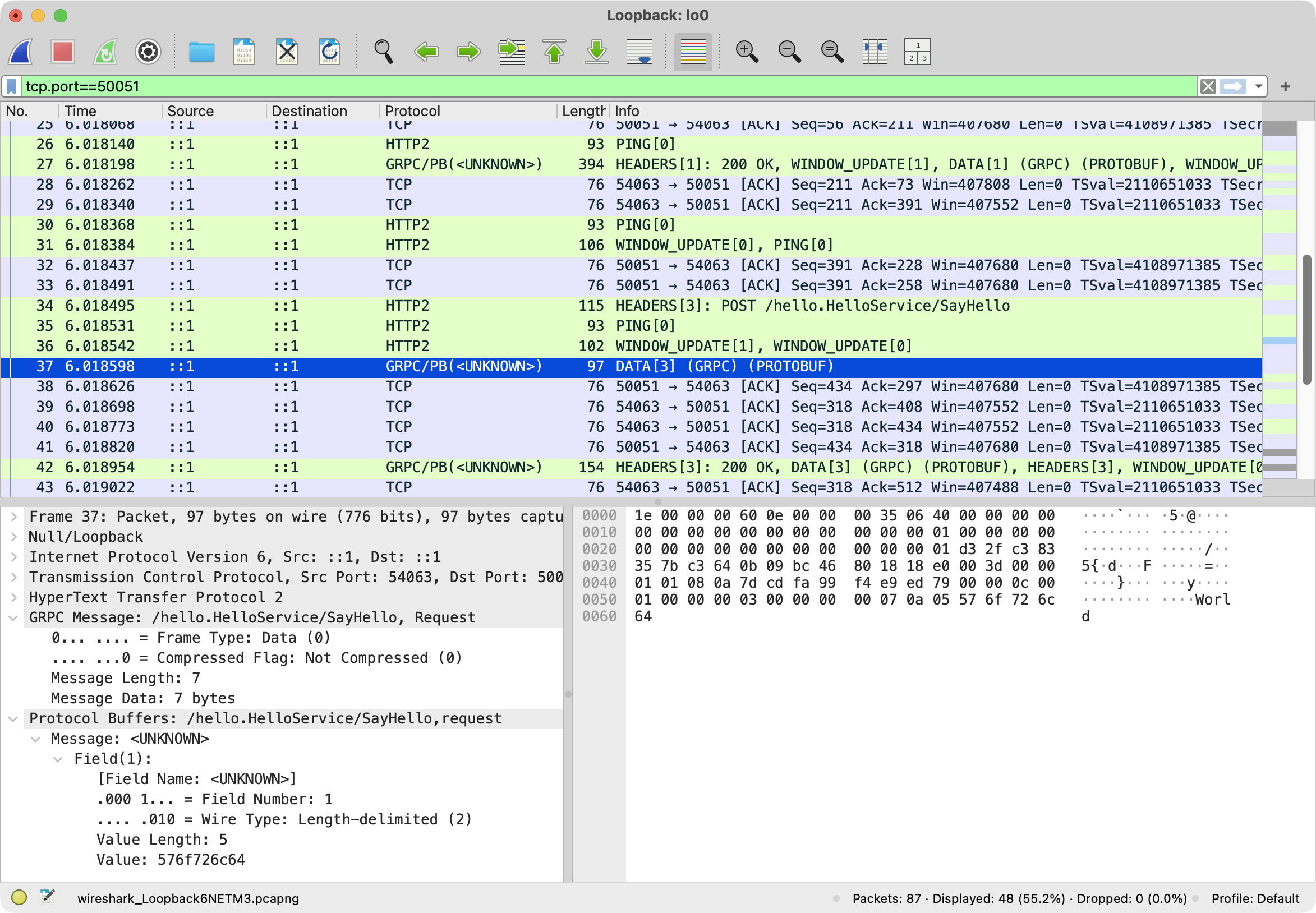 执行 grpcurl -plaintext -d '{"name":"World"}' localhost:50051 hello.HelloService/SayHello 的同时,开启 Wireshark 抓下网络包
