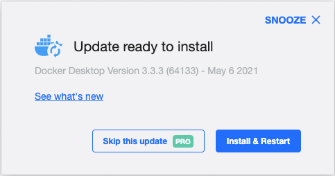 最近本人在 Mac OS X 下安装的 Docker Desktop 经常蹦出要升级的窗口,Skip this update PRO不能用,Install & Restart也总是失败,所以每次只能SNOOZE。原来觉得事有蹊跷,后来才知道这或许与近日吵得沸沸扬扬的 Docker Desktop 收费计划有关。Docker Desktop 是专门为 Windows 和 Mac OS X 定制的,Mac OS X 和 Windows 都是开发人员用的平台。Linux 下可以不用 Docker Desktop,Linux 下 Docker 之间甚至一层窗户纸都没有,实际部署的 Docker 服务也是运行在 Linux 下的。