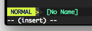 5) Insert Normal Mode: 在插入模式时,按下<Ctrl-o>组合键后进入该模式, 此时可接受一个 Action (Operator + Motion = Action), 比如3dd, 然后自动返回到插入模式。<Esc>也能从 Insert Normal Mode 返回到插入模式。这方便了插入模式只想执行一次指令操作时来回切换, Insert Normal Mode 在 Vim 的状态栏中显示为下图那样 - NORMAL --(insert) --