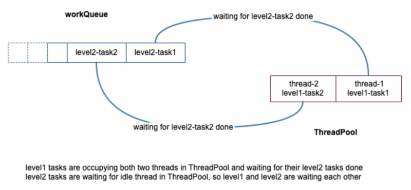 waiting...因为线程池占满了,永远得不到空闲的线程来执行 "level2 task"。线程状态可以看到线程池中的两个线程都是 "WAITING (parking)" 状态。简单用下图分析一下为什么产生死锁状态