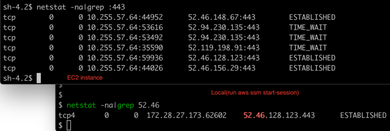 $ aws ssm start-session --target i-0c0072d1212832d20To further explore how Session Manager communicates with EC2 instance, check network connections on both local machine and EC2 instance.