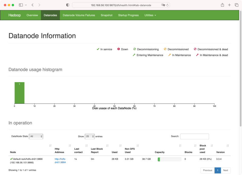 vagrant@hdfs-dn01:~$ hdfs --daemon stop datanode再查看 http://192.168.56.100:9870/dfshealth.html#tab-datanode,就有了 hdfs-dn01 这个数据节点了