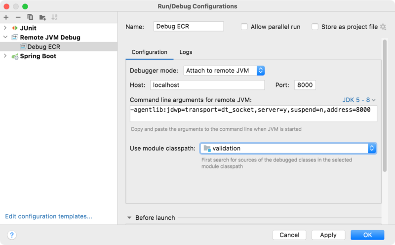 要调试 Docker 镜像需要先从 ECR 中下载到 AWS 服务用的镜像,下面以运行 Java 的 Docker 为例,同时用 IntelliJ IDEA 关联源代码进行远程调试。