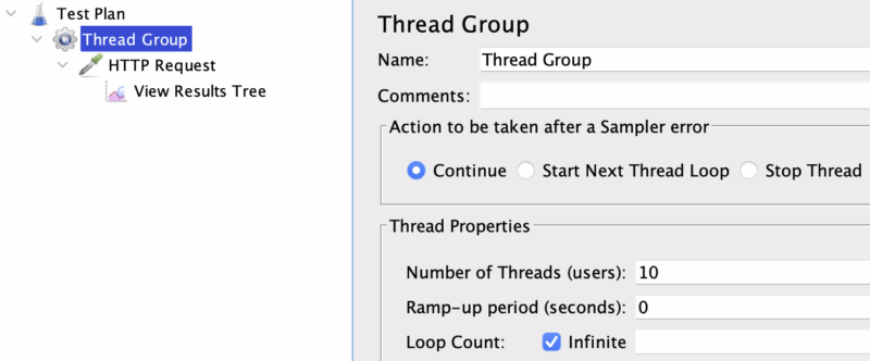 通过调整上面的 Number of Threads (users) 数目来填塞请求,HTTP Request 请求的是 http://localhost:8080/test/99999999