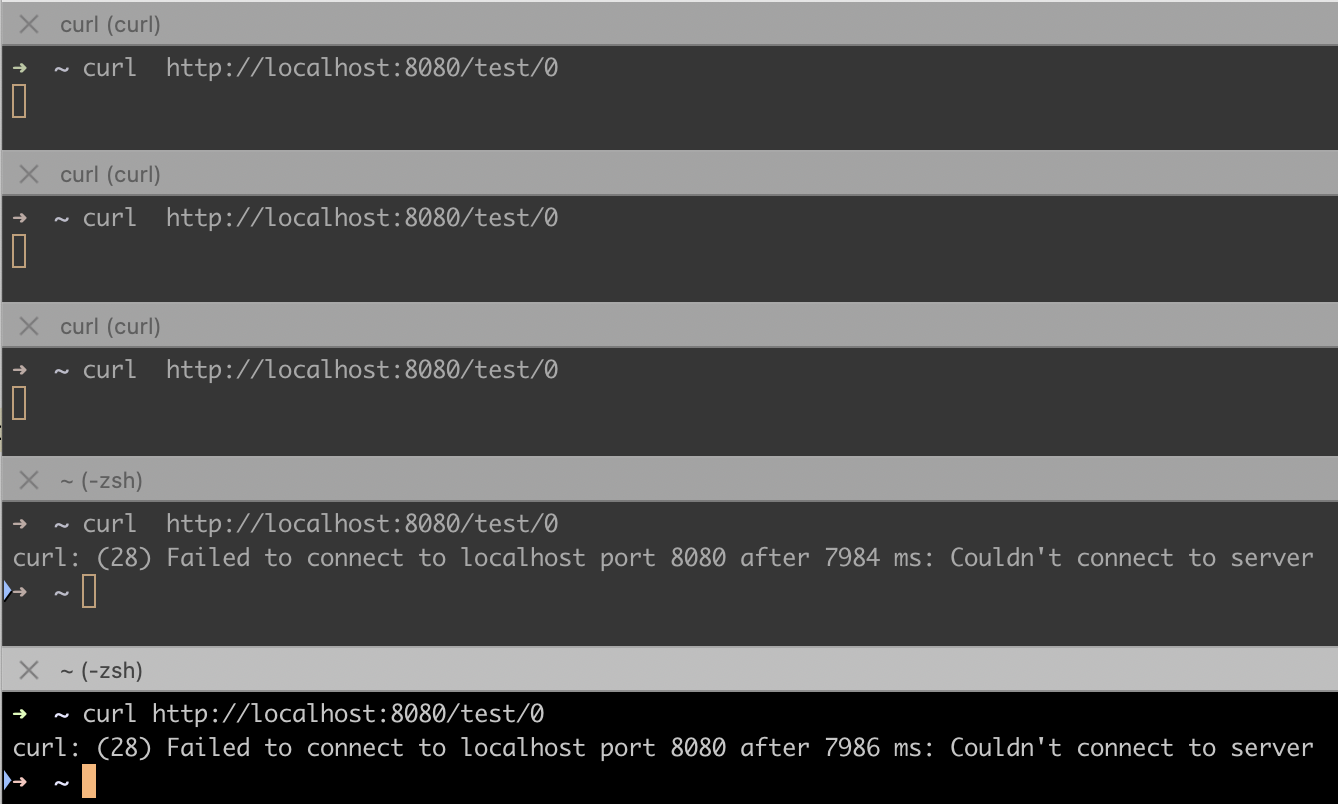 @RestController @SpringBootApplication public class DemoController { private static final AtomicLong counter = new AtomicLong(); public static void main(String[] args) { SpringApplication.run(DemoController.class, args); } @GetMapping("/test/{sleep}") public String test(@PathVariable long sleep) throws Exception { if (sleep < 0) { counter.set(0); return "reset"; } System.out.println(Thread.currentThread().getName() + ": " + counter.incrementAndGet()); Thread.sleep(sleep); return "test"; } } |