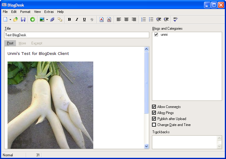 它的功能也较实,对于中文支持的很好,整体要优于前面的 BlogDesk。使用 WordPress 的接口来上传图片和附件, 会上传到 wp-content/upload/ 中某个年月对应的目录中,还支持从 Flickr 中引入图片,没有 FTP 的支持。 可编辑本地发布到的日志,如果在别处修改过此日志,再编辑就成问题了。 无法设置日志的 Slug,即永久链接。又不能满足我的要求的。也缺乏本地日志管理功能。