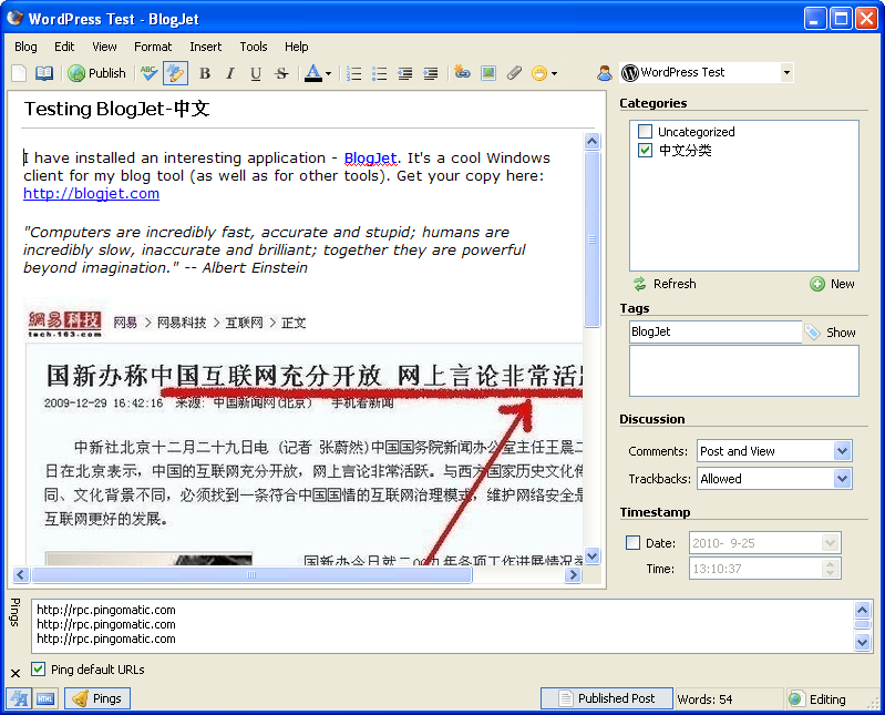 可管理 Ping 服务器,设置是否允许评论和 Ping/Trackback。 可编辑摘要,加入附件,支持中文分类,同样也是不能设置日志的 Slug,像我那种自定义链接中用了 %postname% 就不行了。 还有不足之处就是编辑窗口太小,即使程序窗口全屏后,编辑窗口也保持原大小。