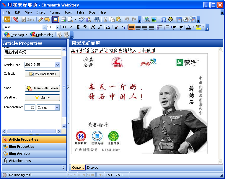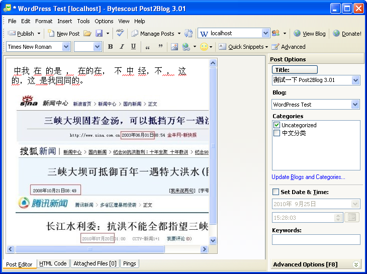 不可否认,它看起来很强大,拥有像 WordPress 一样的编辑能力,但强大的让人不知所措,光设置博客就费我不少脑子,然而翻来翻去, 真没找到要到哪去获取博客的类别,出来了,原来是自动获得的。中文类别会有问题,感觉对 WordPress 来说不太亲近,使用起来并不方便。 发了一篇,贴了个图,点击发布,状态栏不停的报错,然后程序自己关闭了,不知道发生了什么。进到网站上看,文章有了,不过内容有问题,图片也没上来。