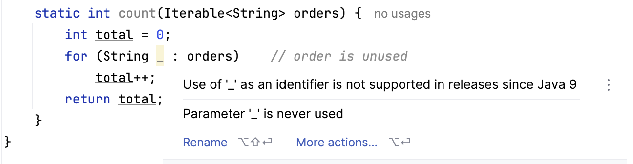 但到了 _ 变成了一定含义的保留字, for(String _: orders) 在 Java 9 中就不合法了, 错误信息是