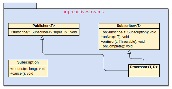 3void onError(Throwable ex)从上面大概能看到一个 Reactive Streams 应用有 Publisher, Subscriber, Subscription 多个角色在参与协作。而一个 Reactive Streams 组件要做的事情就是就是尽可能的把它们做的更完美,高效率且接口更友好。