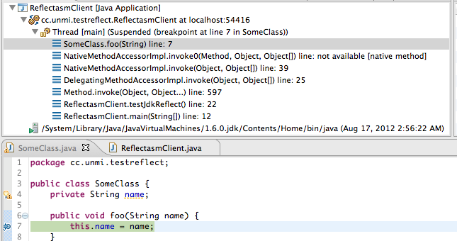 进一步深入的话,不妨看看分别从 testJdkReflect()/testReflectAsm() 到 SomeClass.foo() 过程中到底发生了什么,断点看调用栈。