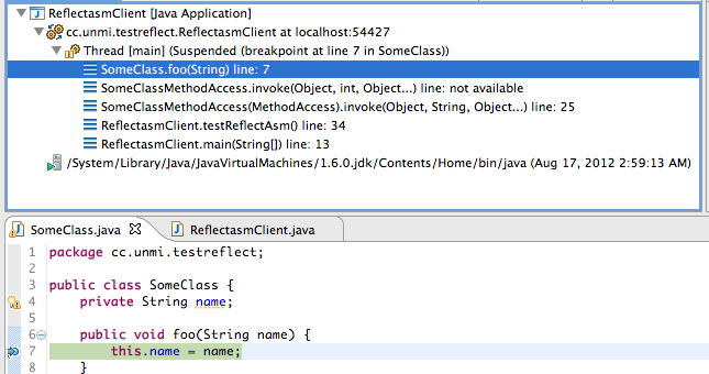 再看 testReflectAsm() 到 SomeClass.foo()的调用栈: