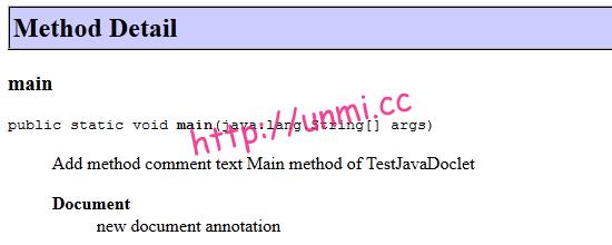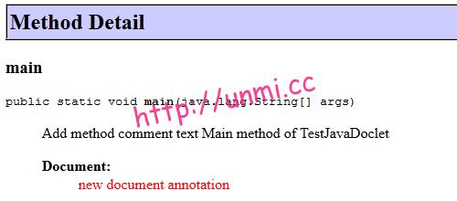 于是我们让前面的 DocumentDoclet 继承自 com.sun.tools.doclets.standard.Standard 后,再执行前面的命令,正常工作,并且新加的 @document 的内容反映在了 API 文档中了: