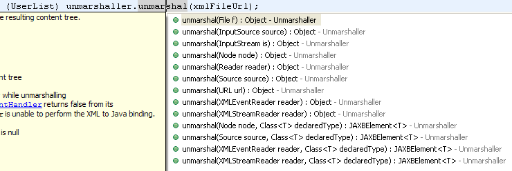 8. 更多注解的使用请浏览下包 javax.xml.bind.annotation 中的所有注解类,像 XmlElementWrapper、XmlList、DomHandler 等,都会有用处的。在 unmarshl 时可支持更多的输入源类型,最后见下几个图: