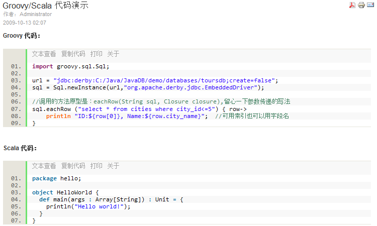 看看对这种语方支持的效果吧,后面没什么好说的,就是会在插入代码选择语言时多了两个选项:Groovy 和 Scala。前台截了个图: