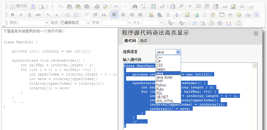 当前支持的语法有 C++、C#、CSS、Delphi、Java、JavaScript、PHP、Python、Ruby、SQL、VB.NET、XML/HTML。因为采用的语法高亮程序是 dp.SyntaxHighlighter 1.5.1,要扩展让它支持其他语言也相当容易。加个相应的 Brush 脚本,然后弹出窗中加个下接项,应该就 OK 啦。本博客先前就是用的 dp.SyntaxHighlighter 1.5,现在用的 dp.SyntaxHighlighter 2.0。