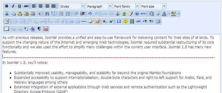 该图是扩展功能的工具条,皮肤是 Office 2007 Blue,引文和正文的分割线显示为红色虚线。可以全屏,以 HTML 编辑时不太友好,会弹出一个窗口来显示相应的 HTML 代码,不过没关系,可直使用输入框下 Joomla 为它提供的 Toggle editor 按钮在可视界面与代码界面间切换。