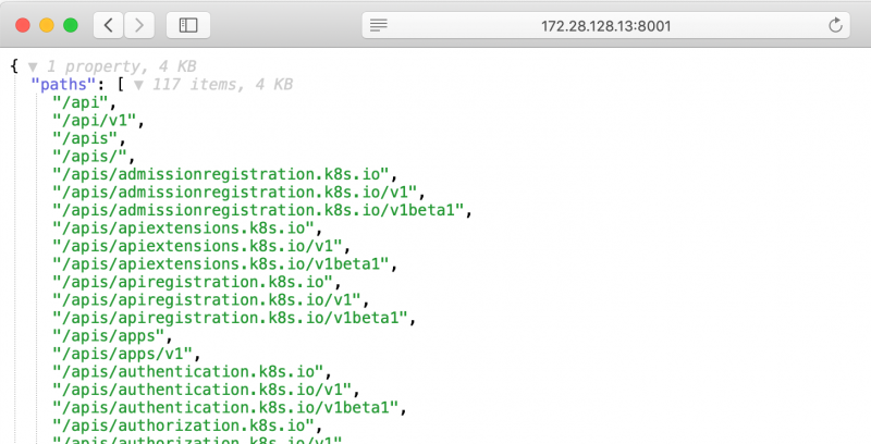 像 Elasticsearch 一样有一套完备的 API,Kubernetes 也有自己一套,在 Master 上执行以下命令# kubectl proxy --address=172.28.128.13 --accept-hosts='^.*'在浏览器中打开 http://172.28.128.13.8001