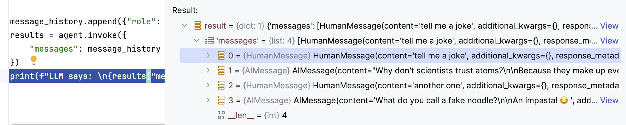 14results = agent.invoke({"messages": [{"role": "user", "content": "tell me a joke"}]}, config=config1)