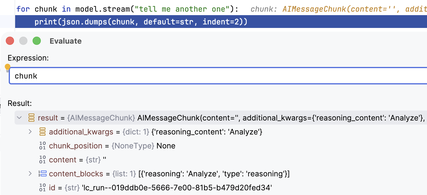 8{"model":"gemma4:e4b","created_at":"2026-04-29T18:13:51.747906Z","message":{"role":"assistant","content":""},"done":true,"done_reason":"stop","total_duration":611004334,"load_duration":274585917,"prompt_eval_count":34,"prompt_eval_duration":54066083,"eval_count":8,"eval_duration":250991666}每个 chunk 是一个 token, 最后一个 json 是模型响应的结束标记,包含模型响应的元数据。反应在 Python 代码中 model.invoke(...)
