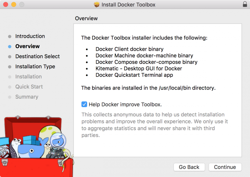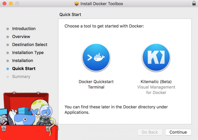 然后就 Continue, 选择安装路径, 按提示输入 sudo 密码, 由于 Docker Toolbox 检测到我已安装了 Virtual Box, 所以不曾提示我去下载安装 Virtual Box.