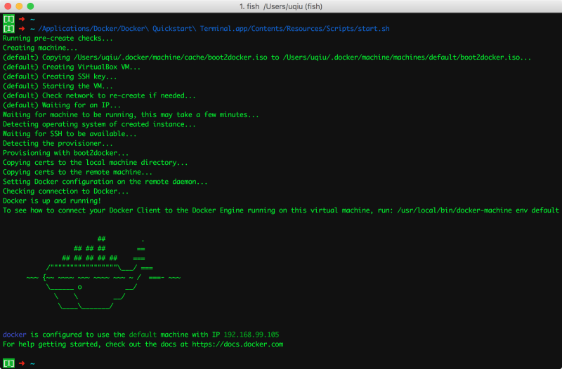 如果安装的是 Docker Toolbox 的话, 可以执行 Docker Quickstart Terminal 来创建 default 虚拟机. 我在 Launchpad 中点击 Docker Quickstart Terminal 后没什么效果, 所以是直接执行相应的命令文件