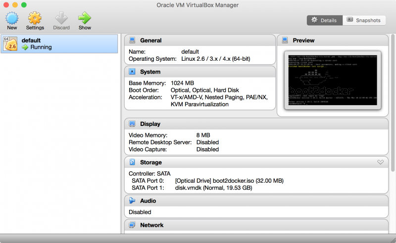 虽然我们新的虚拟机名称变成了 default, 但安装的镜像依旧是 boot2docker.iso. 由于我以前安装过 boo2docker, 所以上面直接从缓存的 boot2docker.iso 创建了 default 虚拟机. 再看看在 Virtual Box 中的样子