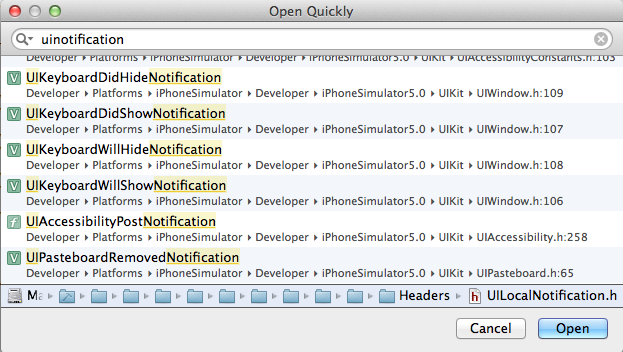 系统里定义了许多的 XxxNotification 名称,其实只要 Cmd+Shift+O 打开 Open Quickly,输入 nsnotification 或者 uinotification 可以看到许多以 Notification 结尾的变量定义,由变量名称也能理解在什么时候会激发什么事件,一般都是向 [NSNotificationCenter defaultCenter] 通知的。