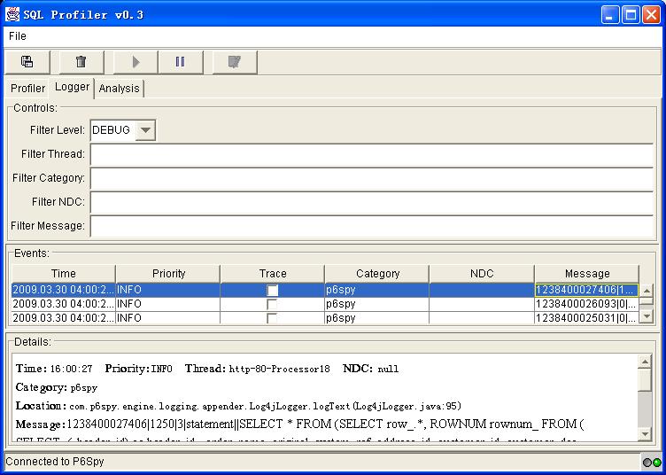p6spy 虽好,但把 SQL 语句输出到文件或是控制台中看起来有些吃力。若能图形界面展示出来便可一目了然,亲切许多。有种方法是配置 p6spy.properties 使用 Log4j 的 SocketAppender,然后启动 Log4j 的 org.apache.log4j.net.SocketServer 界面,或是在 Eclipse log4j plug-in 中也能观察所执行的 SQL 语句。