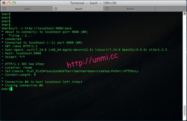 Unmi 注: Flash 域的数据可在服务端重定向到的下一个请求中可见。再来看一个 Flash 域的 Cookie 发生了什么,因为使用了 Redirect 转向,所以用浏览器捕捉不到这时候的 Cookie 值,但可以用 curl -v 命令来查看,见下图: