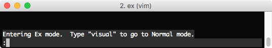 1. 学习完前面的三大模式:正常模式,插入模式和可视模式后,现在步入了命令模式。:, / 或 ?, 和 <C-r>= 分别进入到 Ex 命令,搜索和表达式,它们都被称作命令模式, 以前还常常把正常模式说成是命令模式。: 后的是 Ex 命令,是因为我们仍然沿袭了 Vim 的前身 Ex。我在 Mac 下输入命令 ex 就会看到这个