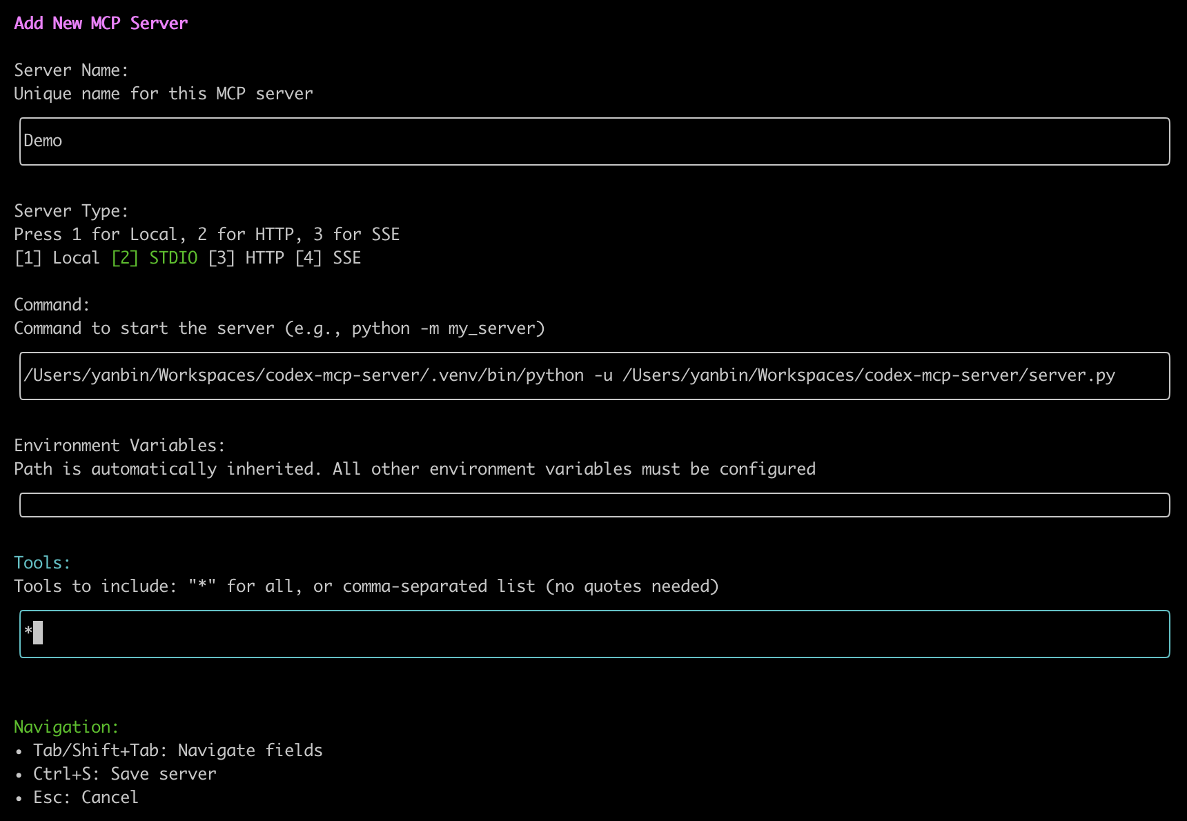 8 "command": "/Users/yanbin/Workspaces/codex-mcp-server/.venv/bin/python",