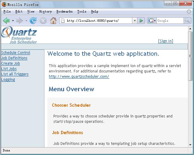 在首页面上所有的菜单选项都是安全的。在最新版本中加入了一个安全过滤器用以模仿容器管理的安全性。这意味着,你可以调用 HttpServletRequest.getRemoteUser() 和 HttpRequest.isUserInRole() 方法,就像是在容器管理的安全性所做的那样。用户被定义在 SecurityFilter-config.xml 文件中。默认时,它包含一个用户,quartz,密码也是 quartz。你可以增加你的用户到 SecurityFilter-config.xml 文件中,或简单的继承 org.securityfilter.realm.SecurityRealmInterface 来提供一个安全域以适应你的需求。
