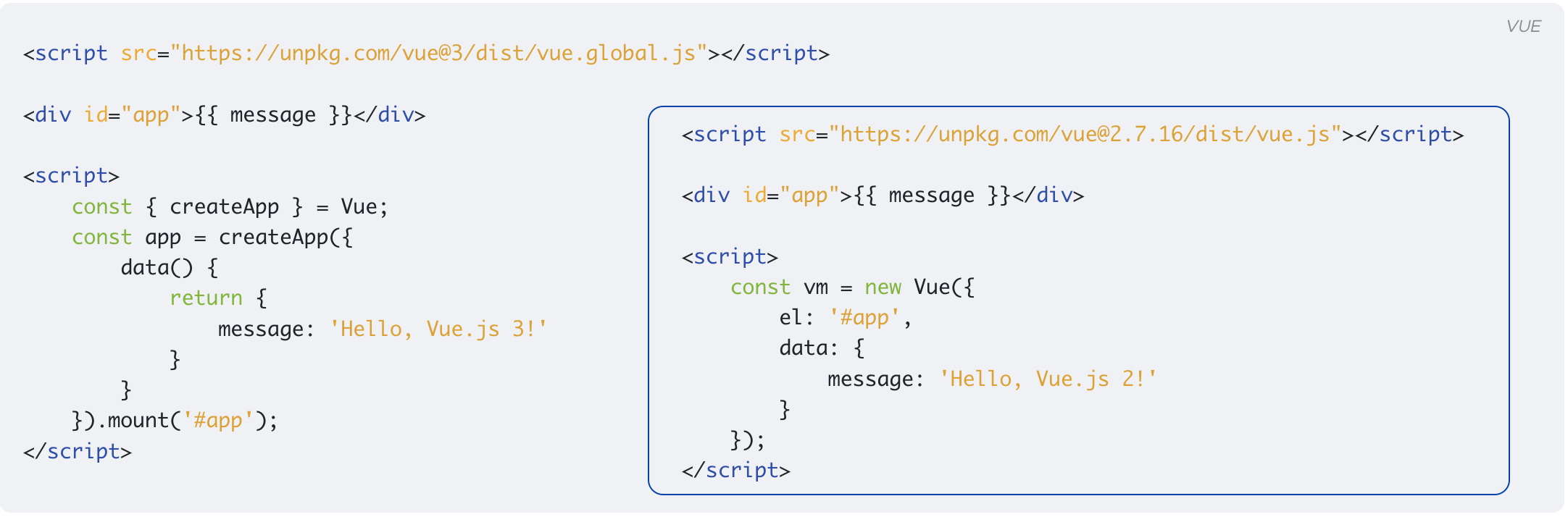 这样页面也能正确显示 Hello, React! 了, 支持了 JSX 语法. 在此我们可对比一下 Vue.js 和极简代码, 代码中省去了不影响页面显示的元素
