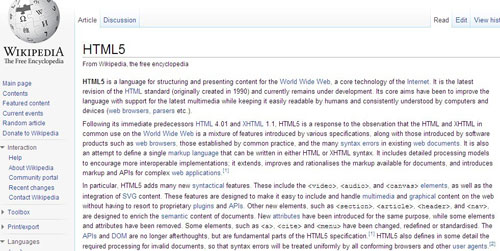 维基百科对HTML5的介绍包括了它的历史、特性、与HTML4.01和XHTML 1.X的异同、HTML5的LOGO、参考资料、深度阅读及相关的链接等等。