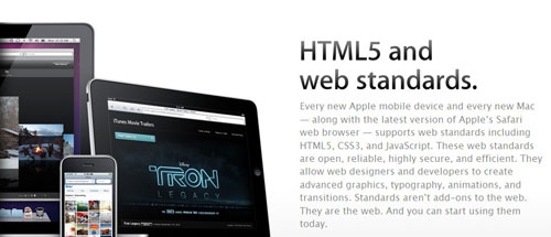 最新的苹果移动设备和每一款Mac,包括最新的Safari浏览器,都支持最新的HTML5、CSS3和JavaScript。这里有苹果关于HTML5的最新成果和案例。