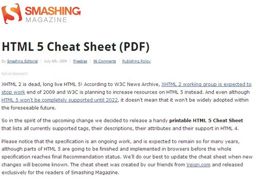 这是一本Mark Pilgrim写的介绍HTML5的畅销书籍,内容包括关于HTML5你不得不知的5件事、HTML5的历史、HTML5包含的元素、视频演示以及更多的使用技巧等等。(6)HTML 5 Cheat Sheet (PDF) – Smashing Magazine(关于HTML5资料的PDF文档精华 )