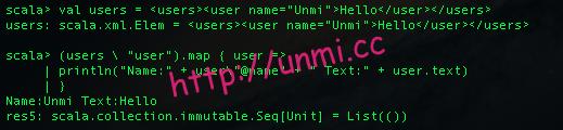 上面演示了 Scala XML 遍历 XML,访问属性,文本节点。方法和遍历 JSON 类似,也有 \ 和 \\ 方法。例如 user\"@name" 访问 name 属性。