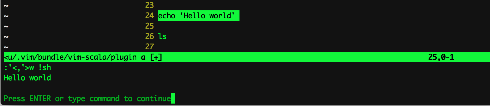 1. if 条件语句 Read More 在 Vi 中如果想选取文本作为 Shell 命令来执行该如何做呢? 想法的背景是想在 Vi 中编辑 Shell 命令,主要是对参数的修改,然后直接选择执行,而不希望复制再贴到 Terminal 下看结果。方法其实很简单,用不着使用 VimShell,关键这个插件的安装还依赖于另两个插件。方法就是: