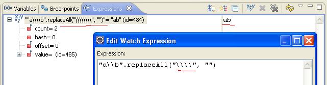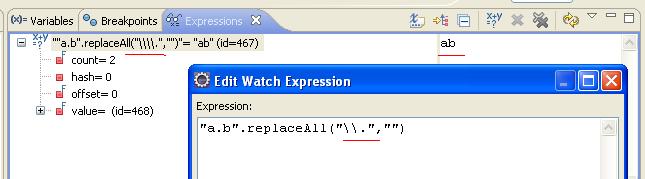 细心的同志一定能看到在调试器里的显示,看我们写成的“\\.”, 在调试器里显示的是 “\\\\.”,说的是如果我们要得到 “\\.”,这样的输出那 Java 的字符串就必须写成 “\\\\.”, 两个斜杠转义出一个斜杠。