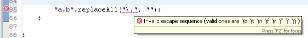 Invalid escape sequence (valid ones are \b \t \n \f \r \" \' \\),也就是 Java 不认 \. 序列,所以还需要前面再加一道杠给其后的斜杠转义出一个斜杠给点号(.) 用,也就是在 Java 字符串看起来是 “\\.”, 但作为正则表达式来说就是 “\.”,这于其语言的正则表达式是一致的。