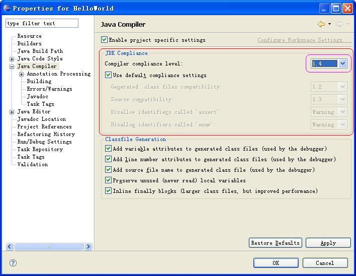自已设定编译选项,你会看到选择不同的 compiler compliance level 是,Generated class files compatibility 和 Source compatibility 也在变,你也可以手动调整那两项,手动设置后你就不用很在乎用的什么版本的编译器了,只要求他生成我们希望的字节码就行了,再引申一下就是即使源代码是用 VB 写的,只要能编译成 JVM 能执行的字节码都不打紧。在其他的 IDE 也能找到相应的设置对话框的。