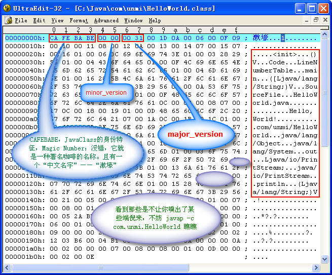 用 JDK 1.5 的 javac -d . HelloWorld.java 编译出来的字节码 HelloWorld.class 用 UltraEdit 打开来的内容如图所示: