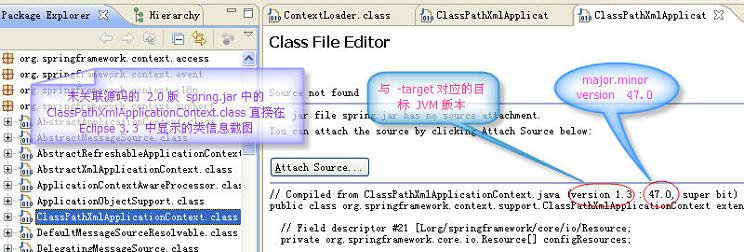 这下要注意啦,它是用的 JDK 1.5 来编译的,那么它是否带了 -target 1.4 或 -target 1.3 来编译的呢?确实是的,可以查看类的二进制文件,这是最保险的。所在 spring-2.0.jar 也可以在 1.4 JVM 中加载执行。