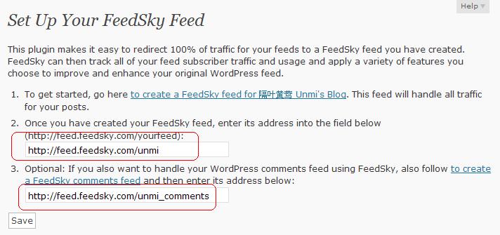 填入你在 FeedSky 上申请到的托管 Feed 的 URL 就行,比如我的日志和评论的 Proxy Feed URL 分别是:http://feed.feedsky.com/unmi 和 http://feed.feedsky.com/unmi_comments。以后不管别人在地址栏里输入什么 url 来访问我的 Feed 的话,都会分别重定向到上面这两个来,最终达到了 Feed URL 的统一,可完整的监测到 Feed 的订阅情况。